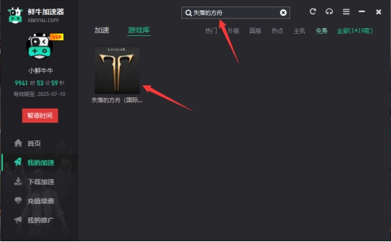 第一步,打开鲜牛加速器搜索:失落的方舟